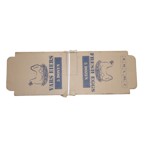 Professional-grade egg carrier designed to safely transport 60 eggs (5 dozen) with printed branding capabilities. The molded compartments provide individual cushioning for each egg, minimizing breakage during handling and transit. Constructed from durable, food-safe materials suitable for commercial poultry operations, farms, and retail distribution. The printed surface allows for custom branding, product information, or regulatory labeling. Engineered for repeated use in high-volume egg production and distribution environments.